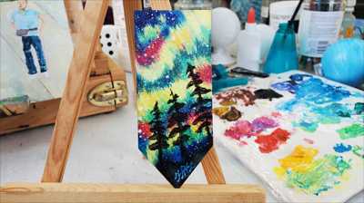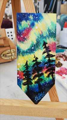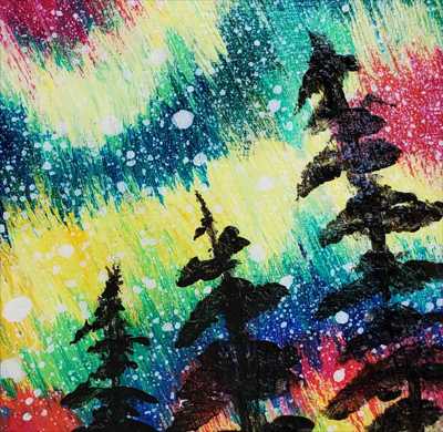 Магнит в форме прямоугольника с северным сиянием по всему небу раскаты света, звезды отражение нарисован акриловыми красками на дереве и покрыт лаком.