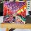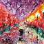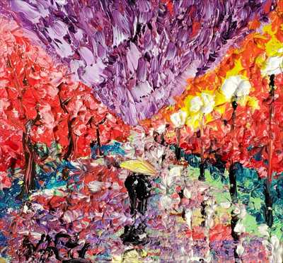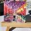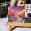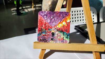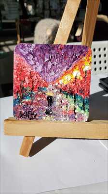 Магнит в форме большого квадрата с тёмно фиолетовым небом и резкими фонарями нарисован масляными красками и мастихином на деревянной основе и покрыт лаком.