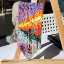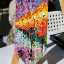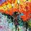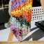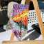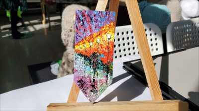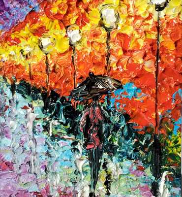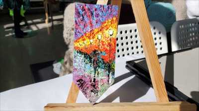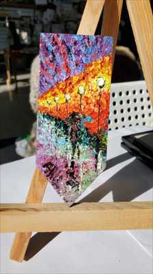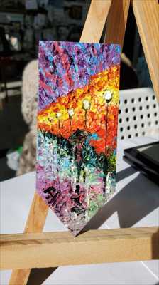 Магнит в форме большого пятиугольника с тёмно фиолетовым небом и квебекскими фонарями нарисован масляными красками и мастихином на деревянной основе и покрыт лаком.