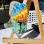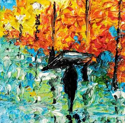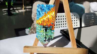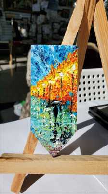 Магнит в форме большого пятиугольника с тёмно синим небом и квебекскими фонарями нарисован масляными красками и мастихином на деревянной основе и покрыт лаком.