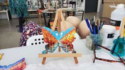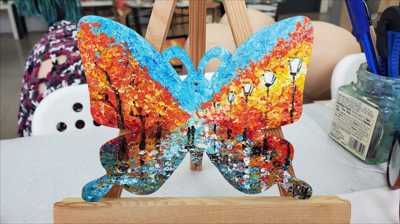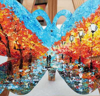 Большая бабочка с картиной парка оранжевое настороение осени нарисована акриловыми красками на деревянной основе и покрыта лаком.