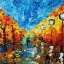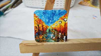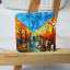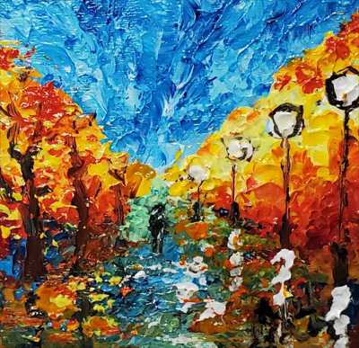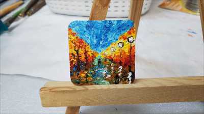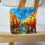 Магнит в форме квадрата с оранжевой аллеей и порывами ветра нарисован акриловыми красками на деревянной основе и покрыт лаком.