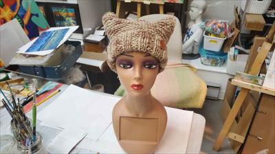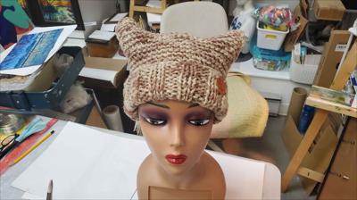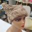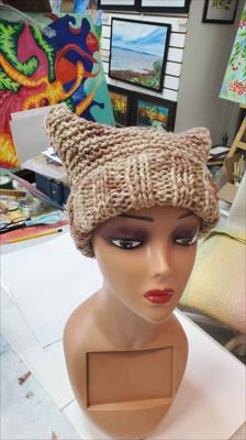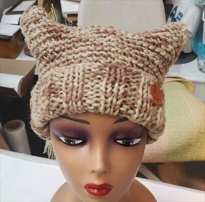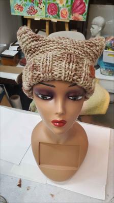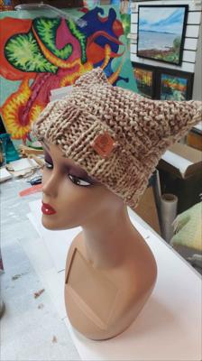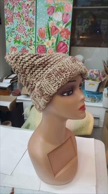 Шапка квадратной формы разноцветная в бежевых тонах платочной вязкой на спицах