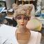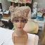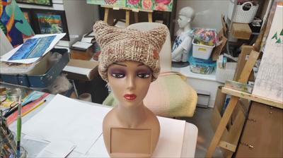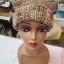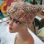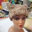 Шапка квадратной формы разноцветная в бежевых тонах платочной вязкой на спицах полностью связана вручную.