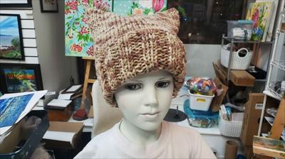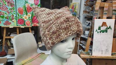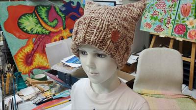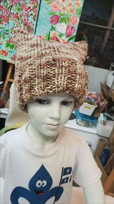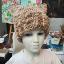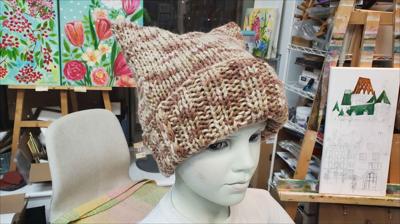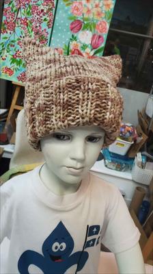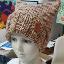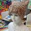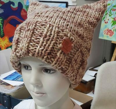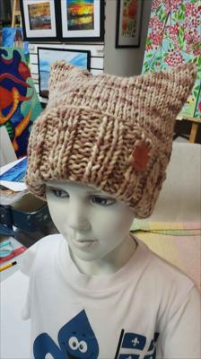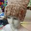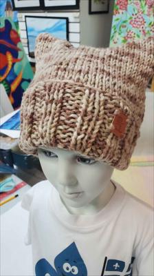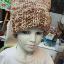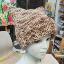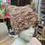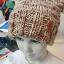 Шапка квадратной формы разноцветная в бежевых тонах классической вязкой на спицах вручную.
