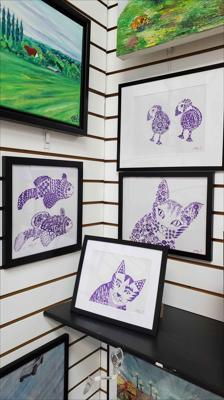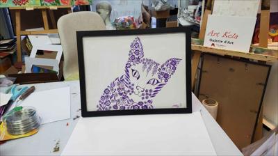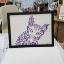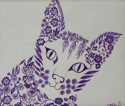 Графика Большая кошка из цветочных мотивов, картина нарисована гелевой ручкой на бумаге и оформлена в раму.