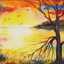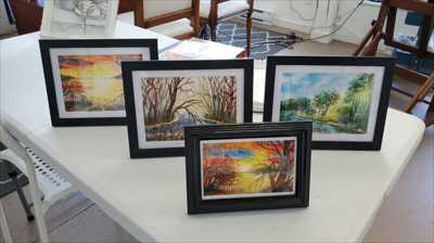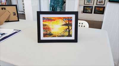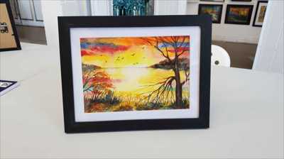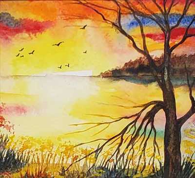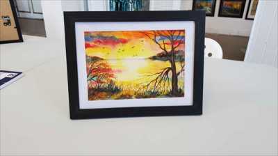 Наблюдаю за птицами, как они на фоне закатного неба парят над красочной гладью озера, картина нарисована акварельными красками на специальной бумаге для акварели FABRIANO и оформлена в раму с паспарту.