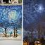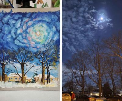 Яркая прозрачная луна озарила небо и подсветила облака вокруг, картина нарисована масляными красками на картоне и оформлена в раму. Художник Наталья Ртищева.