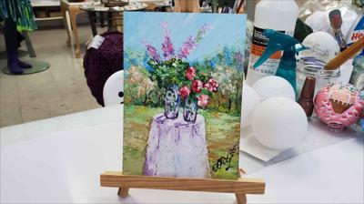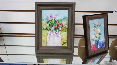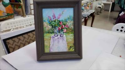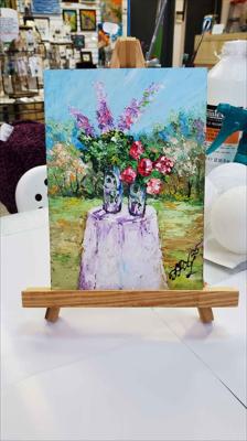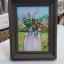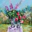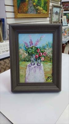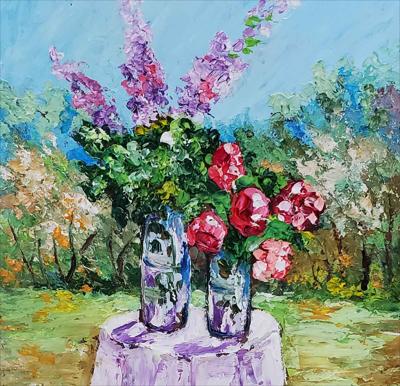 Летний натюрморт. Два прекрасных букета: крупные пионы и большие фиолетовые цветы. Картина нарисована масляными красками на картоне и оформлена в раму.